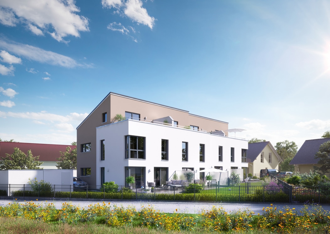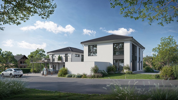 In Stirn, einem Ortsteil von Pleinfeld in Mittelfranken, haben wir neben einem Einfamilienhaus vier Doppelhaushälften mit Blick auf den Brombachsee geplant.